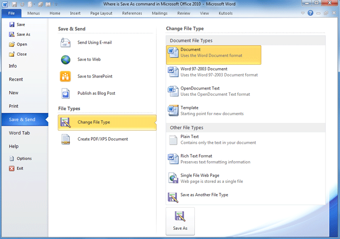 Classic Menu for Office will help you work with Office 2003’s use habit in Microsoft Office 2007/2010/2013/2016/2019 (includes Office 365) because it brings back classic menus and toolbar. So it is easy to find out Save As command if you have it. Take Word 2010 for example: