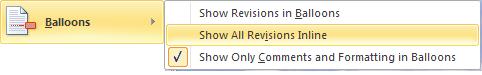 The second item, Balloons, will enable us to select how to show those reviews: Show Revisions in Balloons, Show All Revisions Inline, and Show Only Comments and Formatting in Balloons.