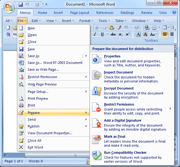 In Microsoft Word 2007, you can access the Prepare commands by clicking the Office Button at the upper-left corner. Click the Prepare button in the drop down pane, and you will view all Prepare commands. See screen shot (Figure 2):
